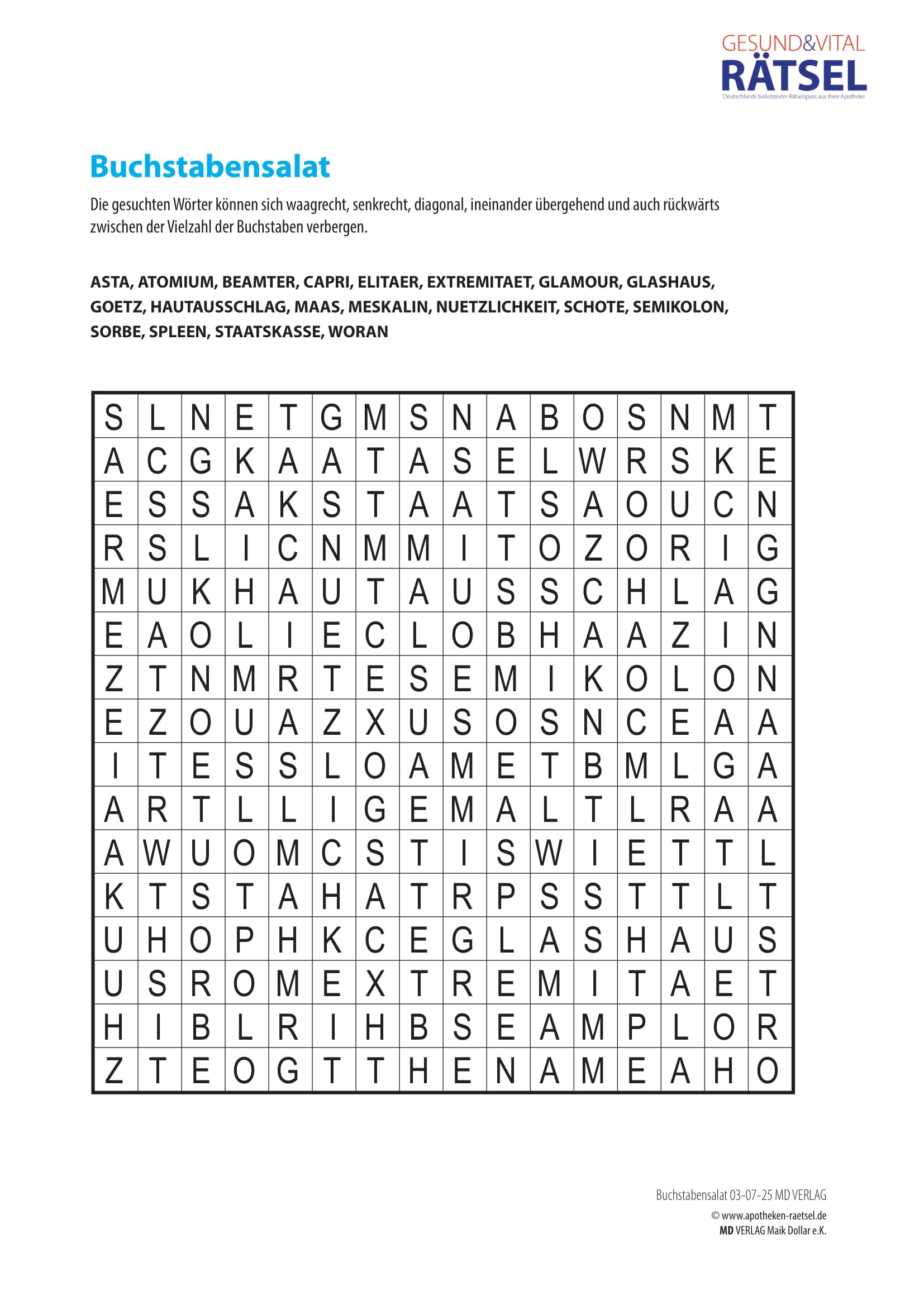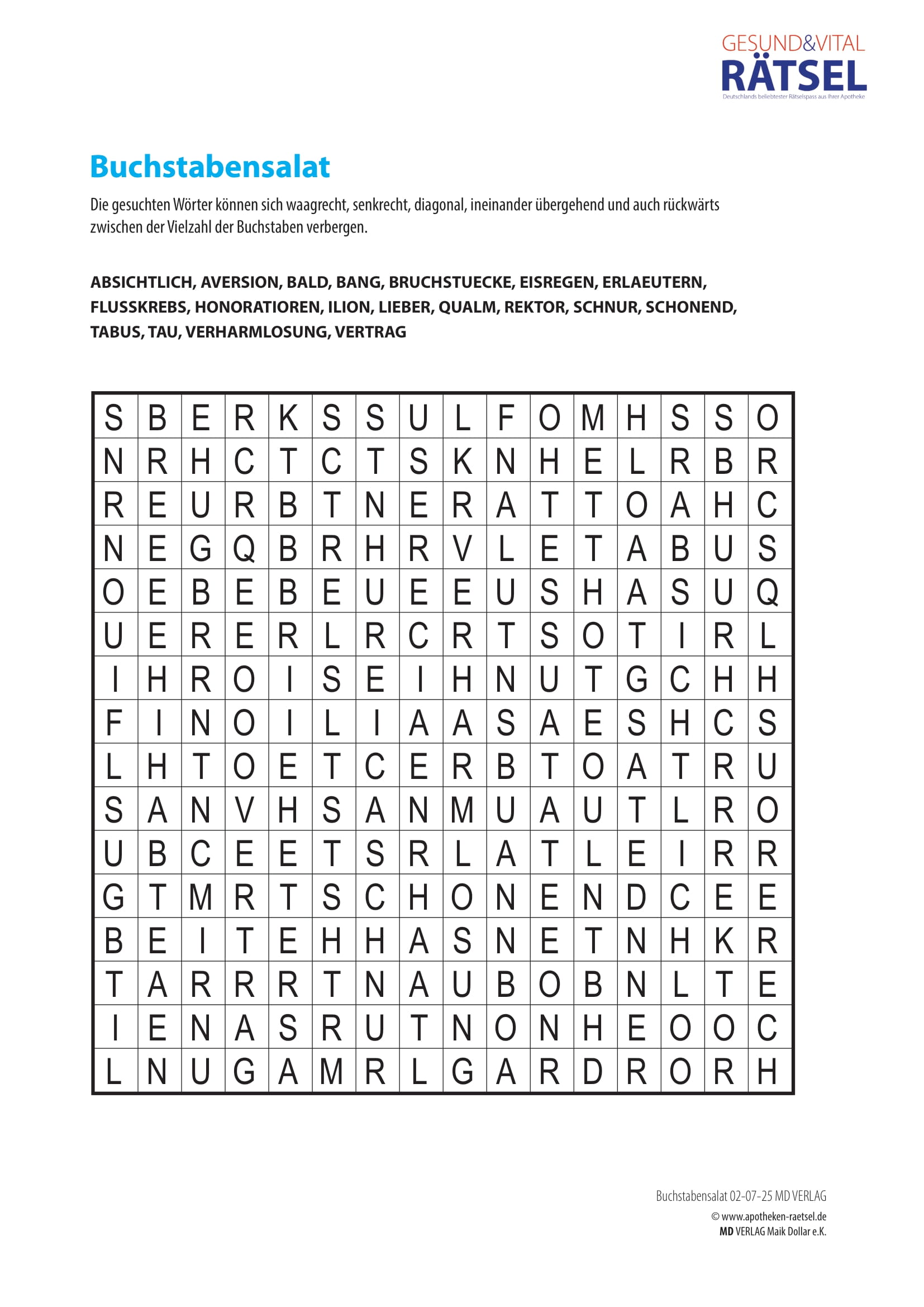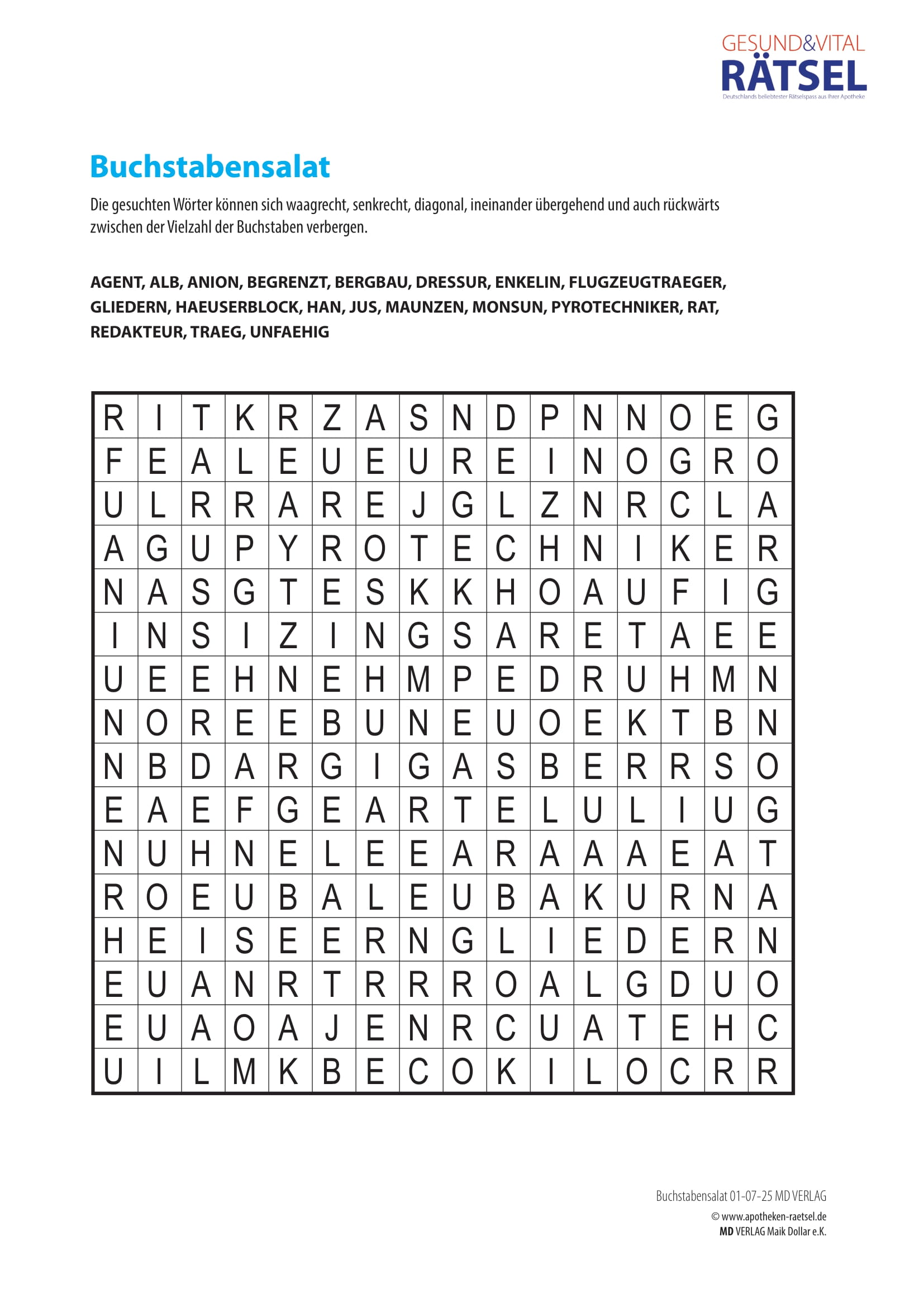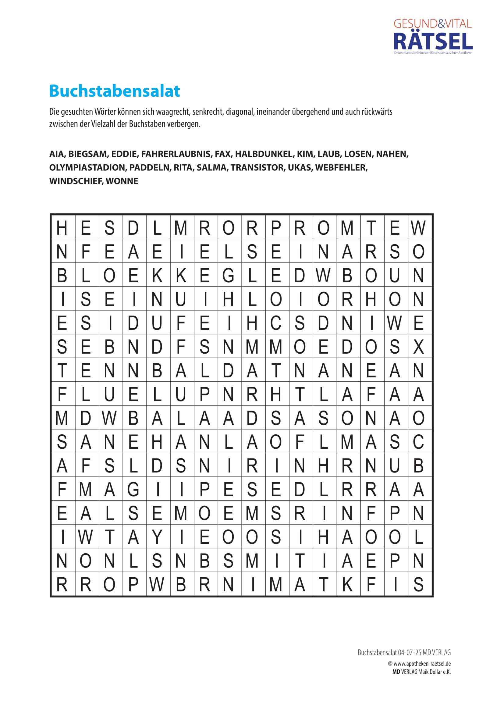 Rätselanleitung: Die gesuchten Wörter beim „Buchstabensalat Rätsel“ können sich waagrecht, senkrecht, diagonal, ineinander übergehend und auch rückwärts zwischen der Vielzahl der Buchstaben verbergen.