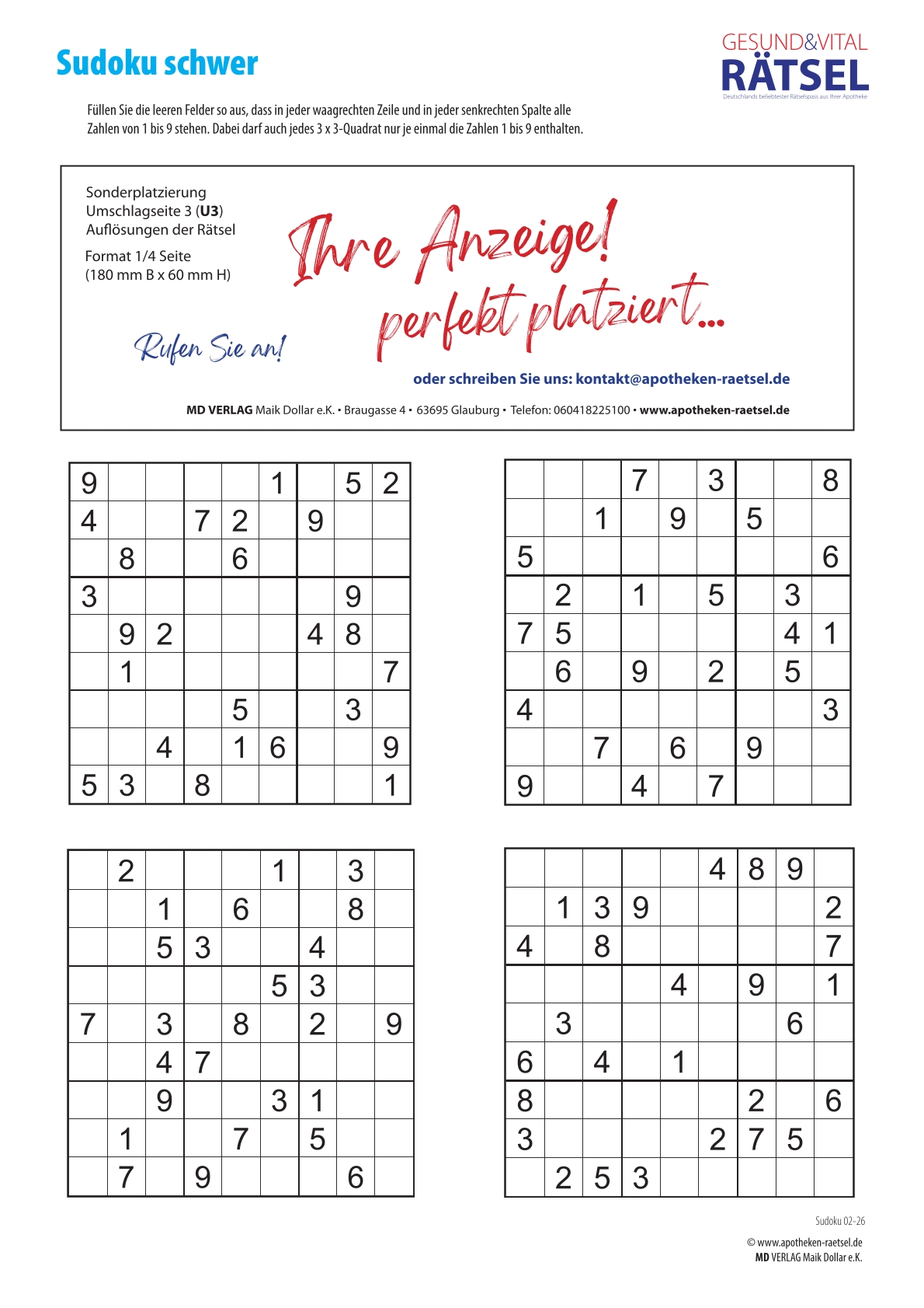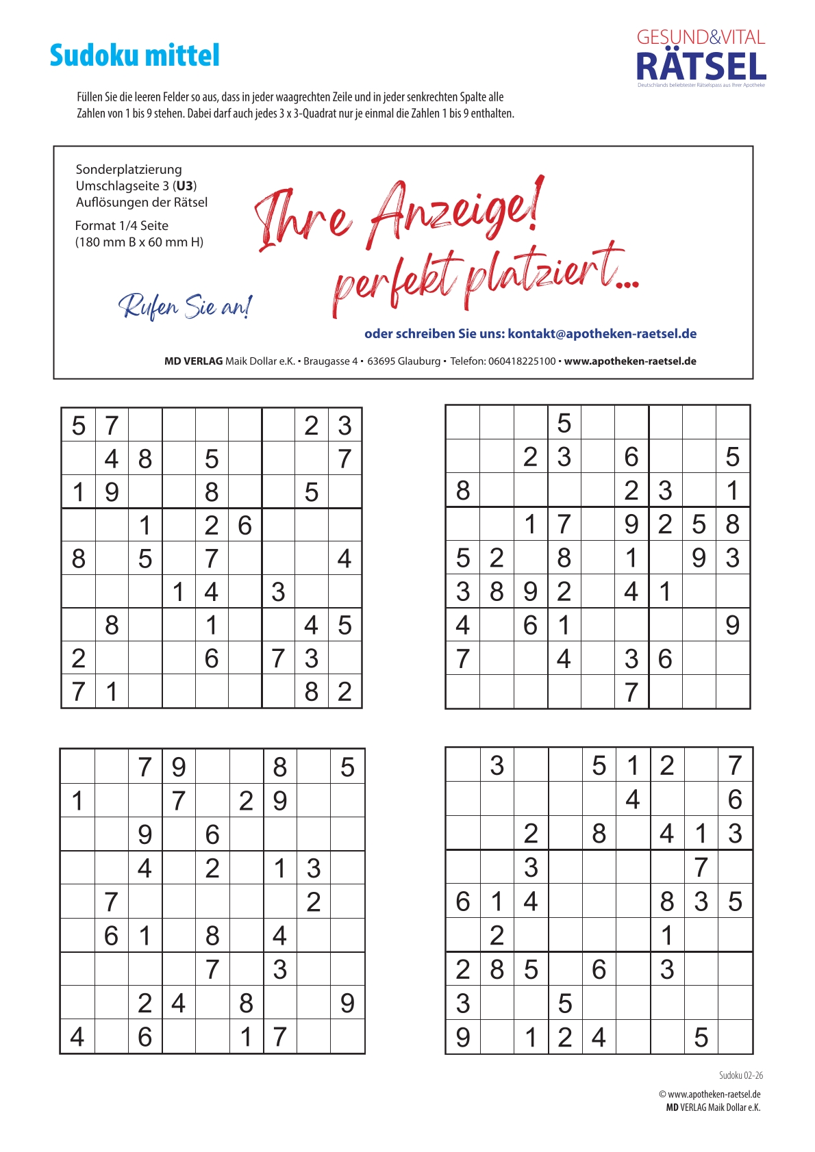 Kostenlose Rätsel (Sudoku Rätsel) zum Downloaden, Ausdrucken und losrätseln. Rätselanleitung: Beim Sudoku füllen Sie die leeren Felder so aus, dass in jeder waagrechten Zeile und in jeder senkrechten Spalte alle Zahlen von 1 bis 9 stehen. Dabei darf auch jedes 3 x 3 Quadrat nur je einmal die Zahlen 1 bis 9 enthalten.